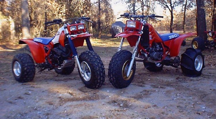 Doug's '85 250R & 350X. The 250R has an FMF pipe, silencer, and ram valve. The 350X is all stock.