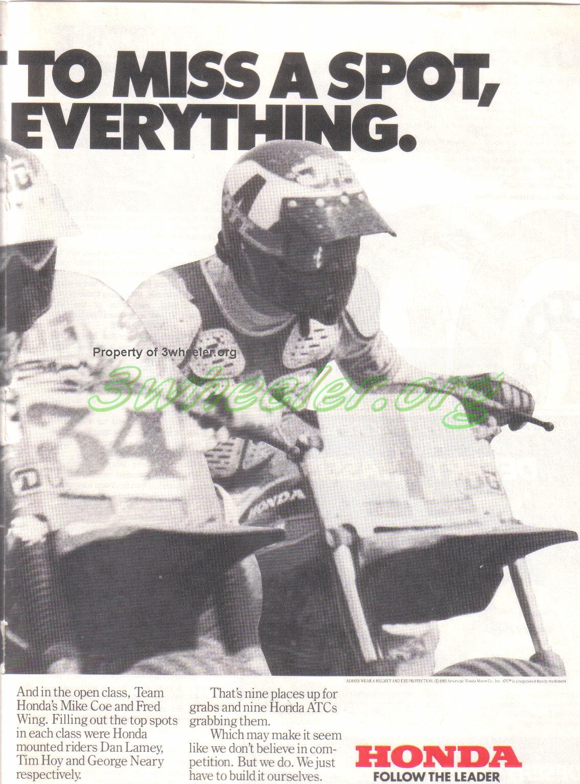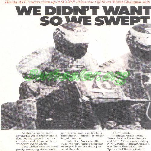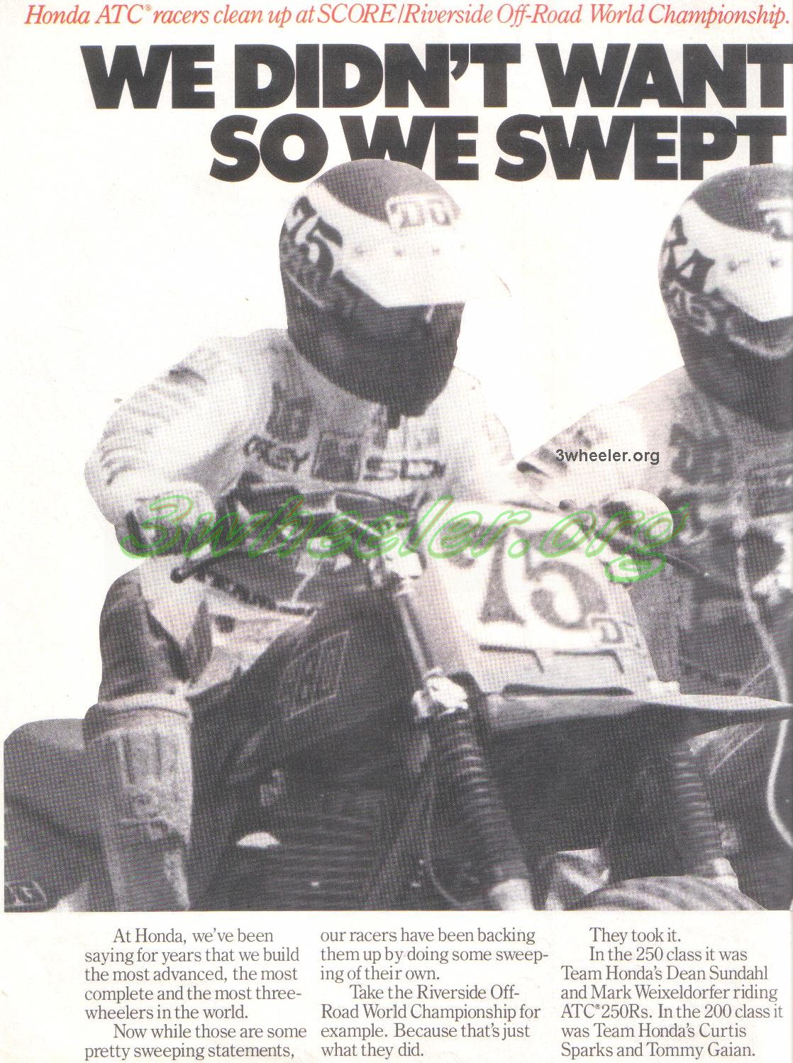 The year 1982. by now the ATC racing scene has exploded. Honda, not only are they entering its racers in every event they can, they are creating new classes along the way. If you look closely at #75 you'll notice Mike Coe is riding a one off ATC 480R and on the other side of #34 Dean Sundahl is #4 Curtis Sparks on a custom 185s