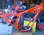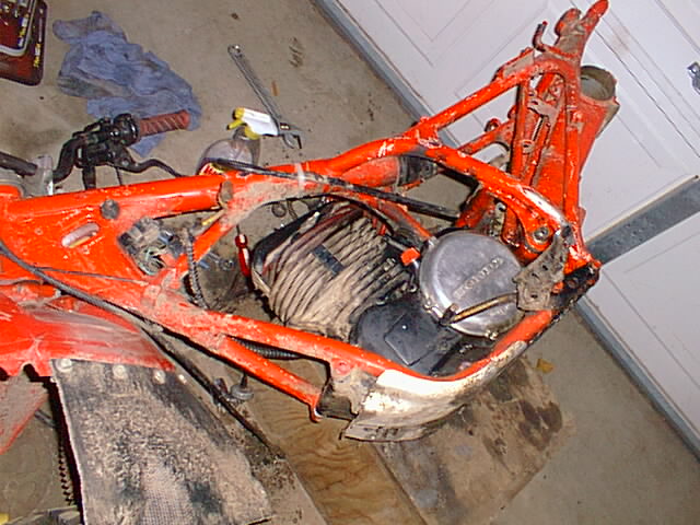 Here is the 83 250r I purchased for $100.00 It runs awsome but I decided to do a complete ground up restoration on her! She came with 250sx rear plastic (Not shown in Pictures) in not too bad of shape, the rear bearing carrier is pretty ugly though! The engine runs real well and transmision seams to be good also! So I decided to just clean the engine up real good and put her back in when I get everything else done! Items I purchased for this on e-bay include!