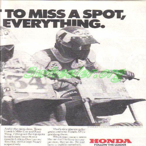 The year 1982. by now the ATC racing scene has exploded. Honda, not only are they entering its racers in every event they can, they are creating new classes along the way. If you look closely at #75 you'll notice Mike Coe is riding a one off ATC 480R and on the other side of #34 Dean Sundahl is #4 Curtis Sparks on a custom 185s