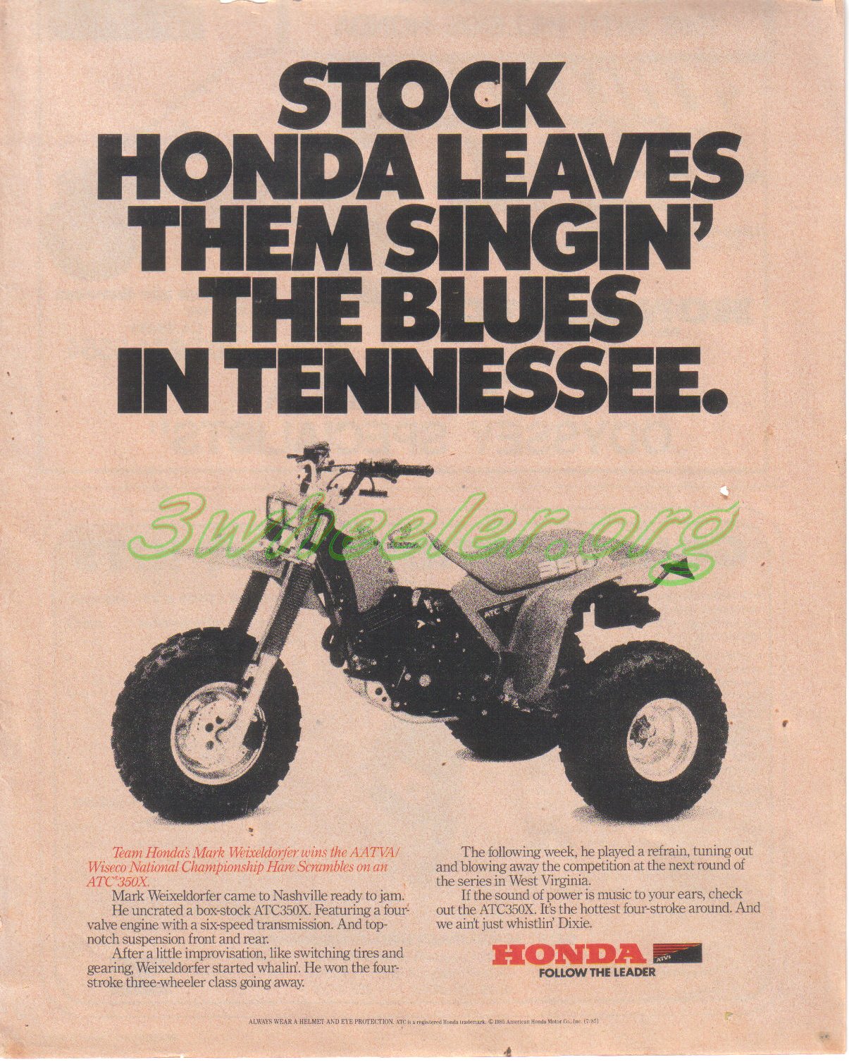 Honda's Biggest production 3wheeler the 350X was never meant to be a full on race trike. Honda learned from the 200 class when Kawasaki raced sleeved down 250 tecates and smoked the 200x's. Even Curtis Sparks couldn't catch the lighter quicker two strokes and besides Honda did have the ATC 500R awaiting production. It was just put on (permement) hold due to recent bad publicity in the press towards 3 wheelers. Never the less Honda wanted some race wins to advertise. So who better to send then Mark Weixeldorfer. "Wax" was Honda's workhorse. He was the one who tested and raced the Nick Nicholson ATC 500X. He helped design the first 250R's, raced in MX, flat track, desert, and along with Dean as their main test rider. How did "Wax" feel about racing the 350X? He wasn't to excited. After all he had to leave sunny Californa to go race in the mud of Tennessee on a unproven stock 4 stroke. So what did he do...he smoked em all so he could go home quicker and Honda never raced the 350X again.